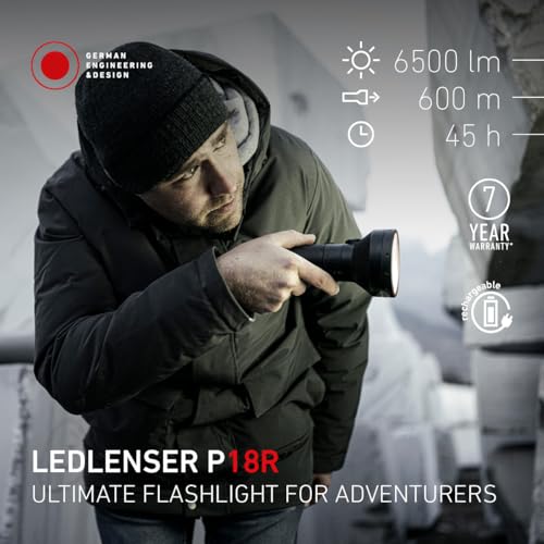 Ledlenser P18R LED Rechargeable Torch, 6500lm Powerful Searchlight, 600m Adjustable Focus, 8 Modes, USB-C, Long Lasting 45 Hour Battery, IP68 Waterproof Flashlight for Camping, Hiking, Emergency