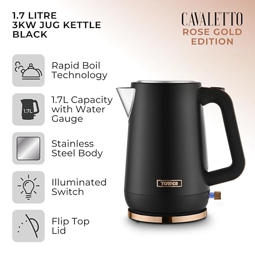 Tower Cavaletto 1.7L Jug Kettle with 3KW Rapid Boil, 360° Swivel Base, Removable Filter, Water Gauge, Stainless Steel Body, Illuminated Switch, Rose Gold & Black, T10100RG