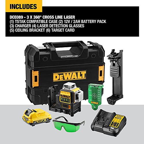DEWALT Self Levelling Multi Line 3 x 360 Degrees Green Beam Laser 12V MAX* with Battery 2.0Ah Li-Ion and Charger Carry Case DCE089D1G