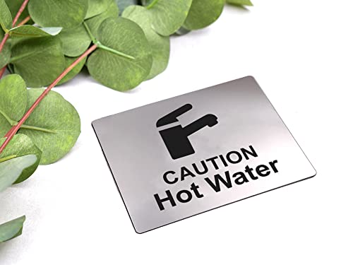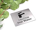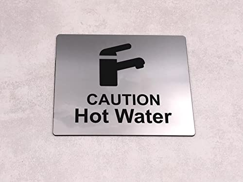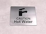 Caution Hot Water Tap Sink Sign with Adhesive Sticker Backing, Metallic Silver Engraved Black with Universal Icon Symbol and Text. Self Adhesive Safety Signs. (Size 12 cm x 10 cm)