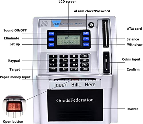 YaBao Pounds Version Electronic ATM Savings Bank Digital Piggy Money Bank Machine,Electronic Cash Box with Debit Card,Password Login,Voice Prompt,Coin Recognition,Targets Setting (Silver/Black)