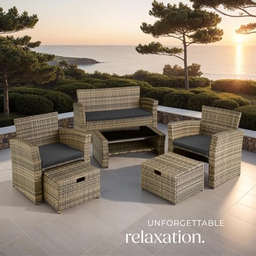 tectake® Rattan Garden Furniture, with 1 Sofa, 1 Table and 2 Chairs with 2 stools, Patio Furniture Includes Garden Storage Box and Protective Cover, Ideal for Garden, Conservatory, patio - natural