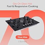 Cookology GGH705BK 70cm Cooktop Burner Gas Hob in Black - 5 Cooking Zones - Cast Iron Pan Supports - Wok Burner - Automatic Ignition Dials - Flame Failure safety