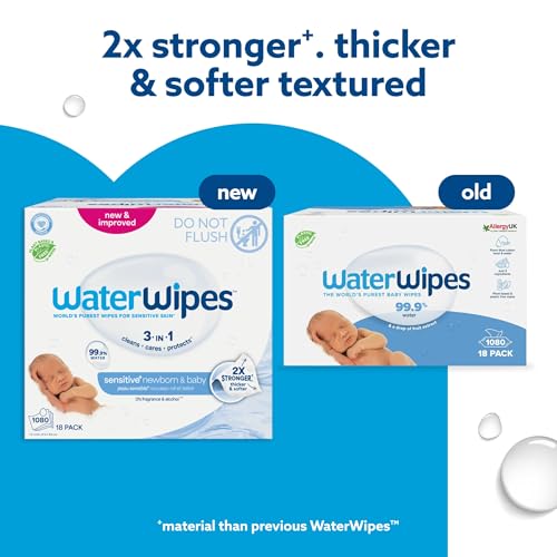 WaterWipes Sensitive+ Newborn & Baby Wipes, 1080 Count (18 Packs), 3-In-1 Cleans, Cares, Protects, 99.9% Water, Unscented