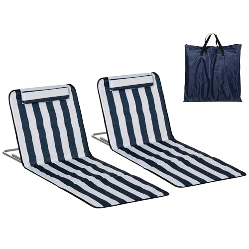 OUTSUNNY 2 Pieces Outdoor Beach Mat Steel Reclining Chair Set w/ Pillow in Blue Blue