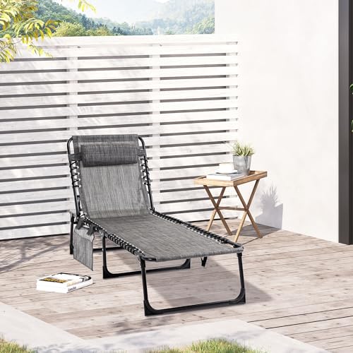 Outsunny Portable Sun Lounger, Folding Camping Bed Cot, Reclining Lounge Chair 5-position Adjustable Backrest with Side Pocket, Pillow for Patio Garden Beach Pool, Mixed Grey
