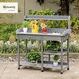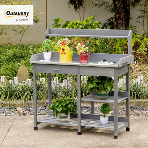 Outsunny Garden Potting Table Workstation W/ Metal Tabletop Drawer Shelves, Grey